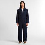 100% Cotton Duck canvas, Collared all-in-one, adjustable shoulder straps, YKK zip front, 6 pockets, top stitch detailing, Elastic at center back, hammer loop, zip close chest pocket, internal access at pocket, double patch knees